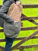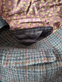 Cross body, one off, upcycled handbag made from a Harris Tweed jacket, fully lined using ditsy floral fabric. Appliqué decoration to back pocket